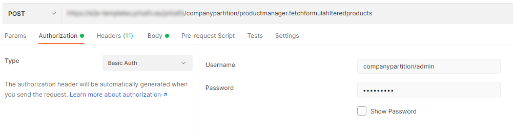 <partitionName>/<yourUserName>. - Enter your password for the partition. :::attention Information When using Postman, you don't need to encode your credentials as it is done automatically by Postman.